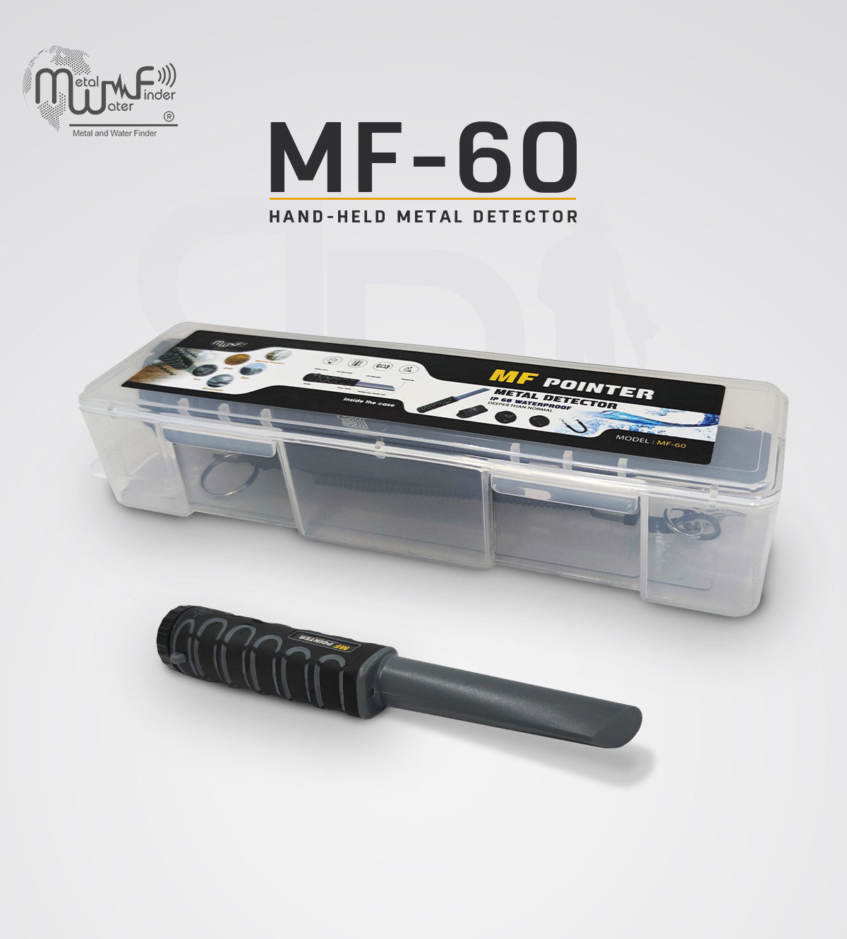 Detektor logam tahan air baru dari MWF Company. Perangkat MF POINTER (MF 60) adalah detektor logam point tahan air portabel dengan desain yang modern dan khas, berukuran kecil dan mudah digunakan. Perangkat MF-60 dirancang untuk digunakan bersama dengan detektor logam profesional untuk menjangkau target yang sangat kecil. Alat ini akurat dan juga dapat digunakan sendiri untuk menemukan target yang dangkal dan barang yang hilang.