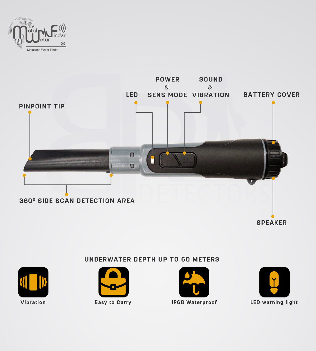 MF90 Locator dan Detektor Logam Multi-Koil, Karena MWF selalu berusaha untuk memenuhi permintaan para penjelajah, petualang, dan bahkan penyelam yang menjelajahi kedalaman laut dan samudra, maka diproduksilah Multi pinpointer (MF-90), detektor logam portabel dan kedap air dengan berbagai kegunaan dan tugas.