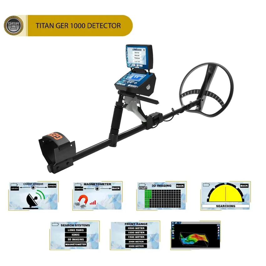 TITAN GER - 1000 adalah alat pencari yang lengkap dengan lima sistem pencarian yang profesional dan inovatif, semua dalam satu alat khusus yang dirancang untuk mendeteksi emas yang terkubur, harta karun, artefak kuno, logam mulia, harta karun kuno, terowongan, gua, berlian dan batu permata di bawah tanah.